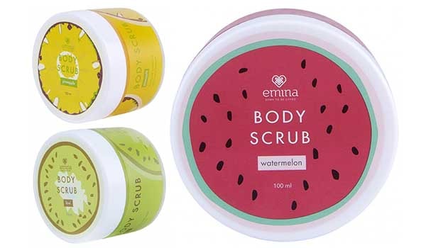 Emina Body Scrub menggunakan ekstrak buah-buahan yang kaya akan manfaat seperti Kiwi, Pineapple, dan Watermelon. Kandungan buah-buahan tersebut memiliki manfaat yang luar biasa, selain itu aroma yang ditawarkan juga menyegarkan dan pastinya tahan lama. Emina menggunakan scrub dengan butiran yang halus sehingga tidak menyakitkan pada saat dioleskan di kulit, sel-sel kulit mati dan kotoran yang menempel akan diangkat dengan mudah.